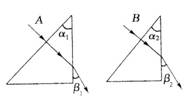 3、如图是两个同种玻璃制成的棱镜,顶角α1略大于α2,两束单色光A和B垂直于三棱镜一个侧面射入后,从第二个侧面射出,两条折射线与第二个侧面的夹角分别为β1和β2,且β1=β2,则下列说法正确是 ( )