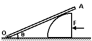21. 如图所示,横截面为四分之一圆(半径为R)的柱体放在水平地面上,一根匀质木棒OA长为3R,重为G。木棒的O端与地面上的铰链连接,木棒搁在柱体上,各处摩擦均不计。现用一水平推力F作用在柱体竖直面上,使柱体沿着水平地面向左缓慢移动。问:
