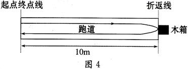 “10米折返跑”的成绩反应了人体的灵敏素质.测定时,在平直跑道上.受试者以站立式起跑姿势站在起点终点线前.当听到“跑”的口令后,全力跑向正前方10米处的折返线.测试员同时开始计时,受试者到达折返线处时,用手触摸折返线处的物体(如木箱),再转身跑向起点终点线.当胸部到达起点终点线的垂直面时,测试员停表,所用时间即为“10米折返跑”的成绩.如图4所示,设受试者起跑的加速度为4 m/s。,运动过程中的最大速度为4 m/s,到达折返线处时需减速到零,加速度的大小为8 m/s。,返回时达到最大速度后不需减速,保持最大速度冲线.受试者在加速和减速阶段的运动均可视为匀变速直线运动.问该受试者“10米折返跑”的成绩为多少秒?