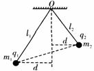 如图所示,两个带有同种电荷的小球,用绝缘细线悬挂于O点,若q1 > q2,l1 > l2,平衡时两球到过O点的竖直线的距离相等,则 ( )