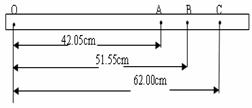 (3)在此实验中,此同学先接通计时器的电源,再放开纸带,如图是在m=100g,M=1kg情况下打出的一条纸带,O为起点,A、B、C为过程中的三个相邻的计数点,相邻的计数点之间有四个点没有标出,有关数据如图所示,其中hA=42.05cm, hB=51.55cm, hC=62.00cm则小车的加速度为a= m/s2,打B点时小车的速度为VB=________ m/s。(保留2位有效数字)
