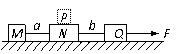 9.如图所示,三个质量不等的木块M、N、Q间用两根水平细线a、b相连,放在光滑水平面上。用水平向右的恒力F向右拉Q,使它们共同向右运动。这时细线a、b上的拉力大小分别为Ta、Tb。若在第2个木块N上再放一个小木块P,仍用水平向右的恒力F拉Q,使四个木块共同向右运动(P、N间无相对滑动),这时细线a、b上的拉力大小分别为Ta/、Tb/。下列说法中正确的是