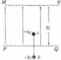 (18分)如图所示,在真空中的竖直平面内,用长为2l的绝缘轻杆连接两个质量均为m的带电小球A和B,A球的电荷量为+4q,B球的电荷量为-3q,组成一带电系统. 虚线MN与PQ平行且相距3l,开始时PQ恰为杆的中垂线. 在虚线MN与PQ间加竖直向上的匀强电场,恰好能使带电系统静止不动. 现使电场强度突然变为原来2倍(已知重力加速度为g),求∶