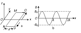 磁悬浮列车是一种高速低耗的新型交通工具。它的驱动系统简化为如下模型,固定在列车下端的动力绕组可视为一个矩形纯电阻金属框,电阻为R,金属框置于xOy平面内,长边MN长为l,平行于y轴,宽为d的NP边平行于x轴,如图所示。列车轨道沿Ox方向,轨道区域内存在垂直于金属框平面的磁场,磁感应强度B沿Ox方向按正弦规律分布,其空间周期为λ,最大值为B0,如图b所示,金属框同一长边上各处的磁感应强度相同,