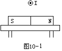 如图10-1,条形磁铁平放于水平桌面上,在它的正中央上方固定一根直导线,导线与磁场垂直,现给导线中通以垂直于纸面向外的电流,则下列说法正确的是: