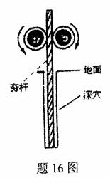 16.如图是建筑工地常用的一种“深坑打夯机”,电动机带动两个滚轮匀速转动将夯杆从深坑提上来,当夯杆底端刚到达坑口时,两个滚轮彼此分开,将夯杆释放,夯杆只在重力作用下运动,落回深坑,夯实坑底,且不反弹。然后两个滚轮再次压紧,夯杆被提到坑口,如此周而复始。已知两个滚轮边缘的线速度恒为v=4m/s,滚轮对夯杆的正压力N=2×104N,滚轮与夯杆间的动摩擦因数μ=0.1,夯杆质量m=1×103kg,坑深h=6.4m,假定在打夯的过程中坑的深度变化不大,可以护绿,取g=10m/s2。求: