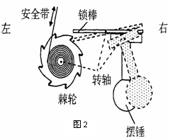 如图2所示是一种汽车安全带控制装置的示意图.当汽车处于静止或匀速直线运动时,摆锤竖直悬挂,锁棒水平,棘轮可以自由转动,安全带能被拉动.当汽车突然刹车时,摆锤由于惯性绕轴摆动,使得锁棒锁定棘轮的转动,安全带不能被拉动.若摆锤从图中实线位置摆到虚线位置,汽车的可能运动方向和运动状态是( )