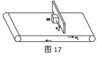 17(12分).一质量为m=2kg的物体置于水平传送带上,随传送带一起以速度v1=2.0m/s向前运动,中途因受到一光滑挡板的阻碍而停止向前运动;现要用一平行于挡板的水平力F将物体以速度v2=1.5m/s沿着挡板拉离传送带,已知板与传送带运动方向垂直(如图17所示),物体与传送带间的动摩擦因数为