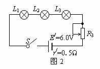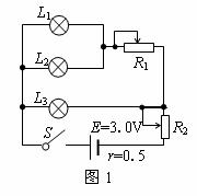 45. (18分)三只灯泡L1、L2和L3的额定电压分别为1.5 V、1.5 V和2.5 V,它们的额定电流都为0.3 A.若将它们连接成图1、图2所示电路,且灯泡都正常发光,