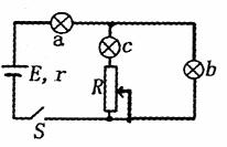 如图所示的电路,闭合开关S后,a、b、c三盏灯均能发光,电源电动势E恒定且内阻r不可忽略。现将变阻器R的滑片稍向上滑动一些,三盏灯亮度变化的情况是 ( )