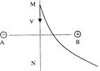 如图所示,A、B带等量异种电荷,MN为A、B连线的中垂线,现有一带电粒子从M点以一定的初速度V射入,开始一段时间内的轨迹如图中实线所示,不考虑粒子所受的重力。则( )
