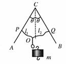 P、Q两个轻质小环分别套在CA、CB上,两根细绳的一端分别系在P、Q环上,另一端和一绳套系在一起,结点为O。将质量为m的钩码挂在绳套上.OP、OQ两根细绳拉直后的长度分别用l1、l2表示,受到的拉力分别用F1和F2表示。 ( )