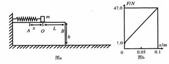 18.如图(a)所示,一根轻质弹簧左端固定在水平桌而上,右端放一个可视为质点的小物块, 小物块的质量为m=1.0 kg,当弹簧处于原长时,小物块静止于O点,现对小物块施加一个外力,使它缓慢移动,压缩弹簧(压缩量为x=0.1m)至A点,在这一过程中,所用外力与压缩量的关系如图(b)所示。然后释放小物块,让小物块沿桌面运动,已知O点至桌边B点的距离为L=2x。水平桌面的高为h=5.0m,计算时,可用滑动摩擦力近似等于最大静摩擦力。g取10m/s2。求: