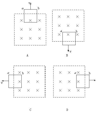 23、粗细均匀的电阻丝围成的正方形线框置于有界匀强磁场中,磁场方向垂直于线框平面,其边界与正方形线框的边平行.现使线框以同样大小的速度沿四个不同方向平移出磁场,如图所示,则在移出过程中线框的一边a、b两点间电势差绝对值最大的是…………………………( )