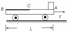 。现给车施加一个向右的水平恒力,使车向右运动,同时金属块在车上开始滑动,当金属块滑到中点C时,即撤去这个力。已知撤去力的瞬间,金属块的速度为v0,车的速度为2v0,最后金属块恰停在车的左端(B点)。求