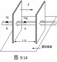 18.如图9-14所示,沿水平方向放置一条平直光滑槽,它垂直穿过开有小孔的两平行薄板,板相距3.5L。槽内有两个质量均为m的小球A和B,球A带电量为+2q,球B带电量为-3q,两球由长为2L的轻杆相连,组成一带电系统。最初A和B分别静止于左板的两侧,离板的距离均为L。若视小球为质点,不计轻杆的质量,在两板间加上与槽平行向右的匀强电场E后(设槽和轻杆由特殊绝缘材料制成,不影响电场的分布),求:⑴球B刚进入电场时,带电系统的速度大小。⑵带电系统从开始运动到速度第一次为零时球A相对右板的位置。(12分)