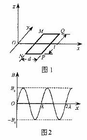 磁悬浮列车的驱动系统简化为如下模型,固定在列车下端的动力绕组可视为一个矩形纯电阻金属框MNPQ,电阻为R,金属框置于xOy平面内,长边MN长为l,平行于y轴,宽为d的NP边平行于x轴,如图1所示。列车轨道沿Ox方向,轨道区域内存在垂直于金属框平面的磁场,磁感应强度B沿Ox方向按正弦规律分布,其空间周期为λ,最大值为B0,如图2所示,金属框同一长边上各处的磁感应强度相同,整个磁场以速度v0沿Ox方向匀速平移。设在短暂时间内,MN、PQ边所在位置的磁感应强度随时间的变化可以忽略,并忽略一切阻力。列车在驱动系统作用下沿Ox方向加速行驶,某时刻速度为v(v<v0)。则列车运行中获得驱动力是_______力,为使列车获得最大驱动力,λ与d之间应满足的关系式是__________________。