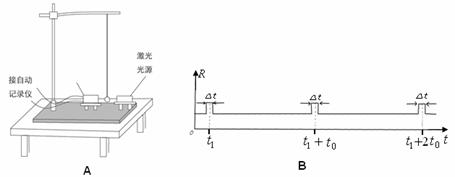 (2)同学乙实验时,为了将人工记录振动次数改为自动记录振动次数,设计如图A所示的装置,若摆球在垂直纸面的平面内摆动,在摆球运动最低点的左、右两侧分别放置一激光光源与光敏电阻与某一自动记录仪相连,该仪器显示的光敏电阻阻值R随时间t变化图线如图B所示,则该单摆的振动周期为 。若保持悬点到小球顶点的绳长不变,改用直径是原小球直径一半的另一小球进行实验,则该单摆的周期将 (填“变大”、“不变”或“变小”)。