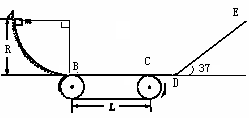 24、如图所示,光滑1/4圆弧形槽的底端B与长L=5m的水平传送带相接,滑块与传送带间动摩擦因数为0.2,与足够长的斜面DE间的动摩擦因数为0.5,斜面与水平面间的夹角θ=37°。CD段为光滑的水平平台,其长为1m,滑块经过B、D两点时无机械能损失。质量m=1kg的滑块从高为R=0.8m的光滑圆弧形槽的顶端A处无初速度地滑下。求 (sin37°=0.6 cos37°=0.8,g=10 m/s2,不计空气阻力) :(1) 当传送带不转时,滑块在传送带上滑过的距离? w.w.^w.k.s.5*