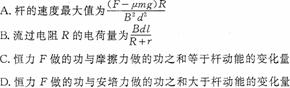 如图所示,固定放置在同一水平面内的两根平行长直金属导轨的间距为d,其右端接有阻值为R的电阻,整个装置处在竖直向上磁感应强度大小为B的匀强磁场中. 一质量为m(质量分布均匀)的导体杆ab垂直于导轨放置,且与两导轨保持良好接触,杆与导轨之间的动摩擦因数为μ. 现杆在水平向左、垂直于杆的恒力F作用下从静止开始沿导轨运动距离l时,速度恰好达到最大(运动过程中杆始终与导轨保持垂直). 设杆接入电路的电阻为r,导轨电阻不计,重力加速度大小为g. 则此过程( )