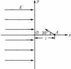 14.(14分)如图所示,在直角坐标系的第一、四象限内有垂直于纸面的匀强磁场,第二、三象限内有沿x轴正方向的匀强电场,电场强度大小为E,y轴为磁场和电场的理想边界. 一个质量为m,电荷量为e的质子经过x轴上A点时速度大小为v0, 速度方向与x轴负方向夹角θ=30º. 质子第一次到达y轴时速度方向与y轴垂直,第三次到达y轴的位置用B点表示,图中未画出,已知OA=l,不计质子重力影响.