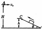 35. (18分)如图所示,质量M=0.45kg的带有小孔的塑料块沿斜面滑到最高点C时速度恰为零,此时与从A点水平射出的弹丸相碰,弹丸沿着斜面方向进入塑料块中,并立即与塑料块有相同的速度.已知A点和C点距地面的高度分别为:H=1.95m,h=0.15m,弹丸的质量m=0.050kg,水平初速度v0=8m/s,取g=10m/s2.求: