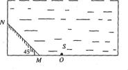 (10分)如图所示,一不透明的圆柱形容器内装满折射率为n=√2的透明液体,容器底部中央0点处有一点光源S,平面镜MN与底面成45º角放置.若容器高为2 dm,底边半径为(1+√3)dm,OM=1 dm,在容器中央正上方1 dm处水平放置一足够长的刻度尺.求光源S出发的光线经平面镜反射后,照射到刻度尺上的长度.(不考虑容器侧壁和液面的反射)