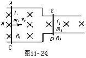 (13分)在如图11-24所示的水平导轨上(摩擦、电阻忽略不计),有竖直向下的匀强磁场,磁感强度B,导轨左端的间距为L1=4L0,右端间距为L2=L0。今在导轨上放置AC,DE两根导体棒,质量分别为m1=2m0,m2=m0,电阻R1=4R0,R2=R0。若AC棒以初速度V0向右运动,求AC棒运动的过程中产生的总焦耳热QAC,以及通过它们的总电量q。