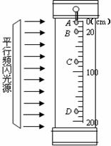 科技馆中有一个展品(展品周围环境较暗),该展品有一个不断均匀滴水的龙头(刚滴出的水滴速度为零),在平行频闪光源的照射下,可以观察到一种奇特的现象:只要耐心地缓慢调节水滴下落的时间间隔,在适当的情况下,看到的水滴好象都静止在各自固定的位置不动,如图中A、B、C、D所示。该展品的最大高度为2m,重力加速度g=10 m/s2。