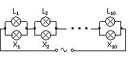 某实物投影机有10个相同的强光灯L1~ L10(24V/200W)和10个相同的指示灯X1~ X10(220V/2W),将其连接在220V交流电源上,电路见右图.若工作一段时间后L1灯丝烧断,则