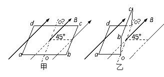 如图甲所示,一个电阻为R、面积为S的矩形导线框abcd,水平放置在匀强磁场中,磁场的磁感应强度为B,方向与ad边垂直并与线框平面成45º角,o、o′分别是ab和cd边的中点.现将线框右半边obco′绕oo′逆时针旋转90º到图乙所示位置.在这一过程中,导线中通过的电荷量是