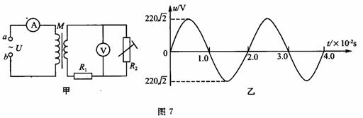 8.如图7甲所示,M是一个小型理想变压器,原副线圈匝数之比n1:n2=10:1,接线柱a、b接上一个正弦交变电源,电压随时间变化规律如图7乙所示。变压器右侧部分为一火警报警系统原理图,其中R2为用半导体热敏材料(电阻随温度升高而减小)制成的传感器,R1为一定值电阻。下列说法中正确的是 ( )