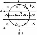 10.如图9所示,空间存在水平向左的匀强电场和垂直纸面向里的匀强磁场,电场和磁场相互垂直。在电磁场区域中,有一个竖直放置的光滑绝缘圆环,环上套有一个带正电的小球。O点为圆环的圆心,a、b、c、d、e为圆环上的五个点,a点为最高点,c点为最低点,bOd沿水平方向,e为ad弧的中点。已知小球所受电场力与重力大小相等。现将小球从环的顶端口点由静止释放,下列判断正确的是( )
