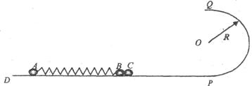 (20分)如图所示,光滑轨道的DP段为水平轨道,PQ段为半径是R的竖直半圆轨道,半圆轨道的下端与水平的轨道的右端相切于P点。一轻质弹簧两端分别固定质量为2m的小球A和质量为m的小球B,质量为m小球C靠在B球的右侧。现用外力作用在A和C上,弹簧被压缩(弹簧仍在弹性限度内)。这时三个小球均静止于距离P端足够远的水平轨道上。若撤去外力,C球恰好可运动到轨道的最高点Q。已知重力加速度为g。求撤去外力前的瞬间,弹簧的弹性势能E是多少?