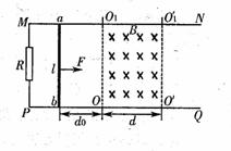 (18分)如图所示,光滑平行的水平金属导轨MN、PQ相距l,在M点和P点间接一个阻值为R的电阻,在两导轨间OO1、O΄O1΄矩形区域内有垂直导轨平面向下、宽度为d的匀强磁场,磁感应强度为曰,一质量为m、电阻为r的导体棒ab,垂直搁置于导轨上,与磁场左边界相距d0,现用一个大小为F的水平向右的恒力拉如棒,使它由静止开始运动,在棒ab离开磁场前已经做匀速直线运动(棒ab与导轨始终保持良好的接触,导轨电阻不计),求: