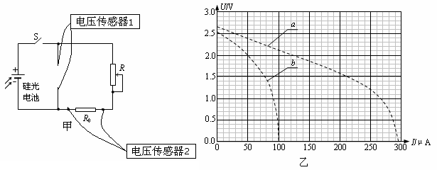 ②实验(一):用一定强度的光照射硅光电池,调节滑动变阻器,通过测量得到该电池的U-I曲线a。见图乙,由此可知电池内阻 (填“是”或“不是”)常数,短路电流为 A ,电动势为 V。