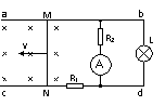 31.(嘉定区)(12分)如图所示,ab、cd为足够长、水平放置的光滑固定导轨,导体棒MN的长度为L=2m,电阻r=1Ω。有垂直abcd平面向下的匀强磁场,磁感强度B=1.5T,定值电阻R1=4Ω,R2=20Ω。当导体棒MN以v=4m/s的速度向左做匀速直线运动时,电流表的示数为0.45A,灯L正常发光。求: