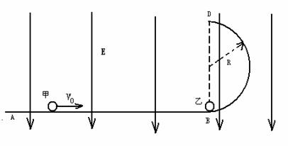 17.(12分)如图,ABD为竖直平面内的光滑绝缘轨道,其中AB段是水平的,BD段为半径R=0.2m的半圆,两段轨道相切于B点,整个轨道处在竖直向下的匀强电场中,场强大小E=5.0×103V/m。一不带电的绝缘小球甲,以速度υ0沿水平轨道向右运动,与静止在B点带正电的小球乙发生弹性碰撞。已知甲、乙两球的质量均为m=1.0×10-2kg,乙所带电荷量q=2.0×10-5C,g取10m/s2。(水平轨道足够长,甲、乙两球可视为质点,整个运动过程无电荷转移)