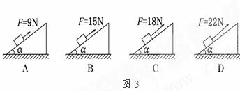 一质量为3 kg的物体,被放置在倾角为α=37°的动摩擦因数为0.2的固定斜面上,在如图3所示的四种情况下不可能处于平衡状态的是(令最大静摩擦力等于滑动摩擦力,sin37°=0.6,cos37°=0.8,g=10 m/s2)
