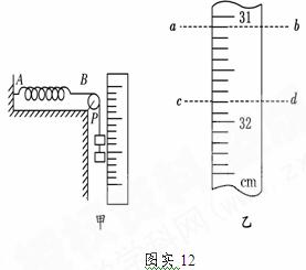 11.(6分) 用如图实12甲所示的装置测定弹簧的劲度系数,被测弹簧一端固定于A点,另一端B用细绳绕过定滑轮挂钩码,旁边竖直固定一最小刻度为mm的刻度尺,当挂两个钩码时,绳上一定点P对应刻度如图12乙中ab虚线所示,再增加一个钩码后,P点对应刻度如图实12乙中cd虚线所示,已知每个钩码质量为50 g,重力加速度g=9.8 m/s2,则被测弹簧的劲度系数为 N/m.挂三个钩码时弹簧的形变量为 cm.