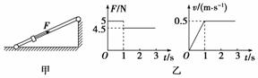 6.如图甲所示,足够长的固定光滑细杆与地面成一定倾角,在杆上套有一个光滑小环,沿杆方向给环施加一个拉力F,使环由静止开始运动,已知拉力F及小环速度v随时间t变化的规律如图乙所示,重力加速度g取10 m/s2.则以下判断正确的是 ( )