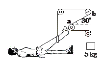 (12分)在医院里常用图示装置对小腿受伤的病人进行牵引治疗.不计滑轮组的摩擦和绳子的质量,绳子下端所挂重物的质量是5 kg,问:
