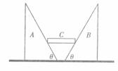 19.(9分)如图所示,两个截面为三角形的实心铁块A、B并排放在粗糙水平地面上,一截 面为矩形的实心铁块C水平地架在两铁块的光滑倒面上,系统处于静止状态。已知三个铁块的重力分别为GA= GB=100N、GC=10N,