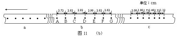 12.如图11(a)所示,小车放在斜面上,车前端栓有不可伸长的细线,跨过固定在斜面边缘的小滑轮与重物相连,小车后面与打点计时器的纸带相连。起初小车停在靠近打点计时器的位置,重物到地面的距离小于小车到滑轮的的距离。启动打点计时器,释放重物,小车在重物的牵引下,由静止开始沿斜面向上运动,重物落地后,小车会继续向上运动一段距离。打点计时器使用的交流电频率为50 Hz。图11(b)中a、b、c是小车运动纸带上的三段,纸带运动方向如箭头所示。