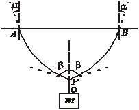 如图所示,一根均质绳质量为M,其两端固定在天花板上的A、B两点,在绳的中点悬挂一重物,质量为m,悬挂重物的绳PQ质量不计。设α、β分别为绳子端点和中点处绳子的切线方向与竖直方向的夹角,则