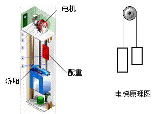 如图所示,电梯由质量为1×103kg的轿厢、质量为8×102kg的配重、定滑轮和钢缆组成,轿厢和配重分别系在一根绕过定滑轮的钢缆两端,在与定滑轮同轴的电动机驱动下电梯正常工作,定滑轮与钢缆的质量可忽略不计,重力加速度g=10 m/s2。在轿厢由静止开始以2 m/s2的加速度向上运行1s的过程中,电动机对电梯共做功为 ( )