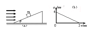 (12分)如图,质量m=1kg的物体沿倾角q=37°的固定粗糙斜面由静止开始向下运动,风对物体的作用力沿水平方向向右,其大小与风速v成正比,比例系数用k表示,物体加速度a与风速v的关系如图b.所示。求:(1)物体与斜面间的动摩擦因数m;(2)比例系数k。