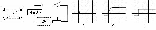 13.(2010· 河南鹤壁市4月模拟)某一电学黑箱内可能有电容器、电感线圈、定值电阻等元件,在接线柱间以如图所示的“Z”字形连接(两接线柱间只.有一个元件)。为了确定各元件种类,某同学把计算机辅助实验系统中的电流传感器(相当于电流表)与一直流电源、滑动变阻器、开关串联后,分别将AB、BC、CD接入电路,闭合开关,计算机显示的电流随时间变化的图象分别如图a、b、c所示,则如下判断中正确的是( )