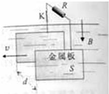 (2010·全国高考重庆理综卷)法拉第曾提出一种利用河流发电的设想,并进行了实验研究。实验装置的示意图可用题图表示,两块面积均为S的矩形金属板,平行、正对、竖直地全部浸在河水中,间距为d.水流速度处处相同,大小为v,方向水平.金属板与水流方向平行。地磁场磁感应强度的竖直分量为B,水的电阻为p,水面上方有一阻值为R的电阻通过绝缘导线和电键K连接到两金属板上。忽略边缘效应,求: