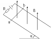 吉林省长白县质量检测)如图所示,两条平行的足够长的光滑金属导轨与水平面成α=53º角,导轨间距离L=0.8m.其上端接一电源和一固定电阻,电源的电动势E=1.5V,其内阻及导轨的电阻可忽略不计. 固定电阻R=4.5Ω.导体棒ab与导轨垂直且水平,其质量m=3×10-2kg,电阻不计. 整个装置处于竖直向上的匀强磁场中,磁感应强度B=0.5T.(g=10m/s2 sin53º=0.8 cos53º=0.6 )